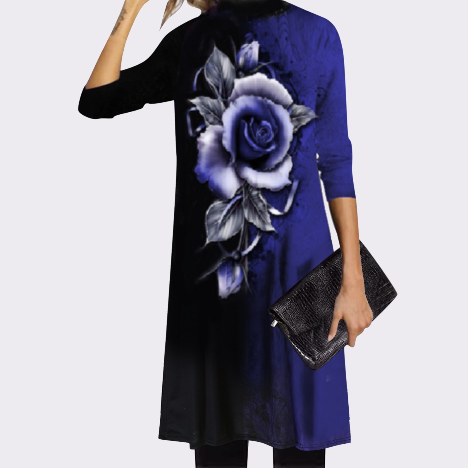 Women's Blue Rose Print Half Turtleneck Long Sleeve Loose Mini Dress$25.99 USDDescribe your product