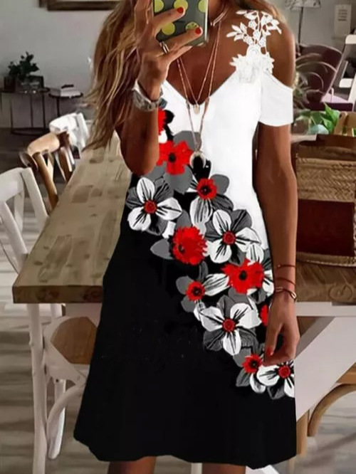 Casual Slimming Printed Short Sleeves V-Neck Lace Cold Shoulder Dress