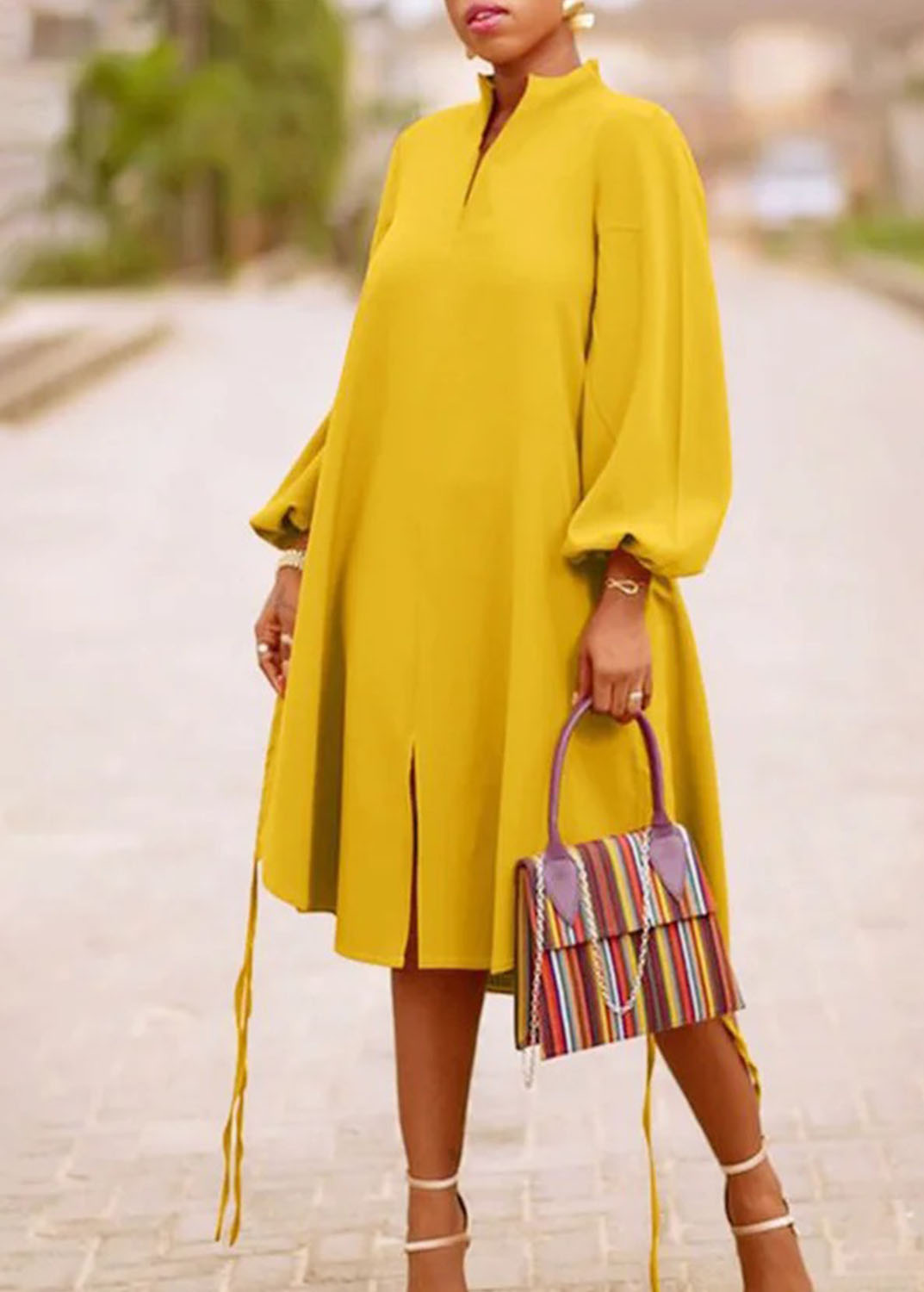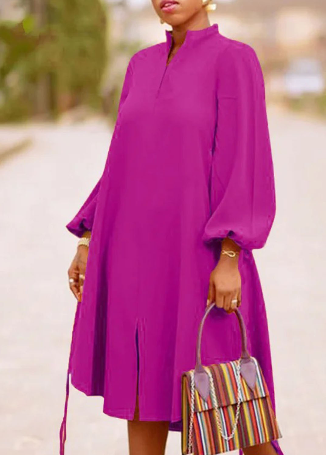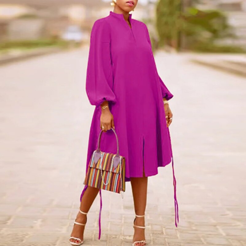 Fashion Solid Color Long Sleeve V Neck Dress