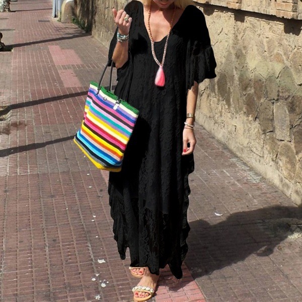 Flared Short Sleeve V-Neck Resort Lace Dress