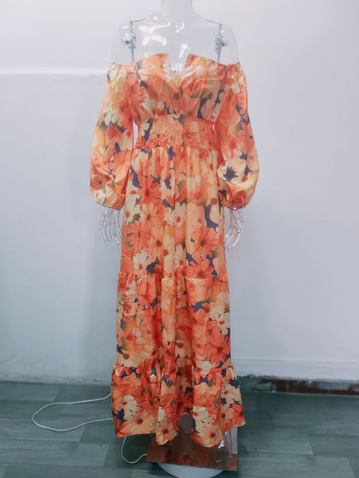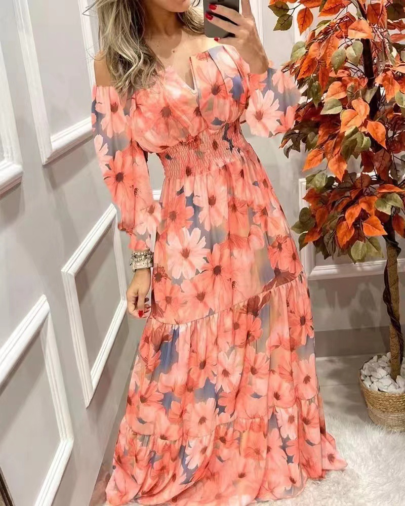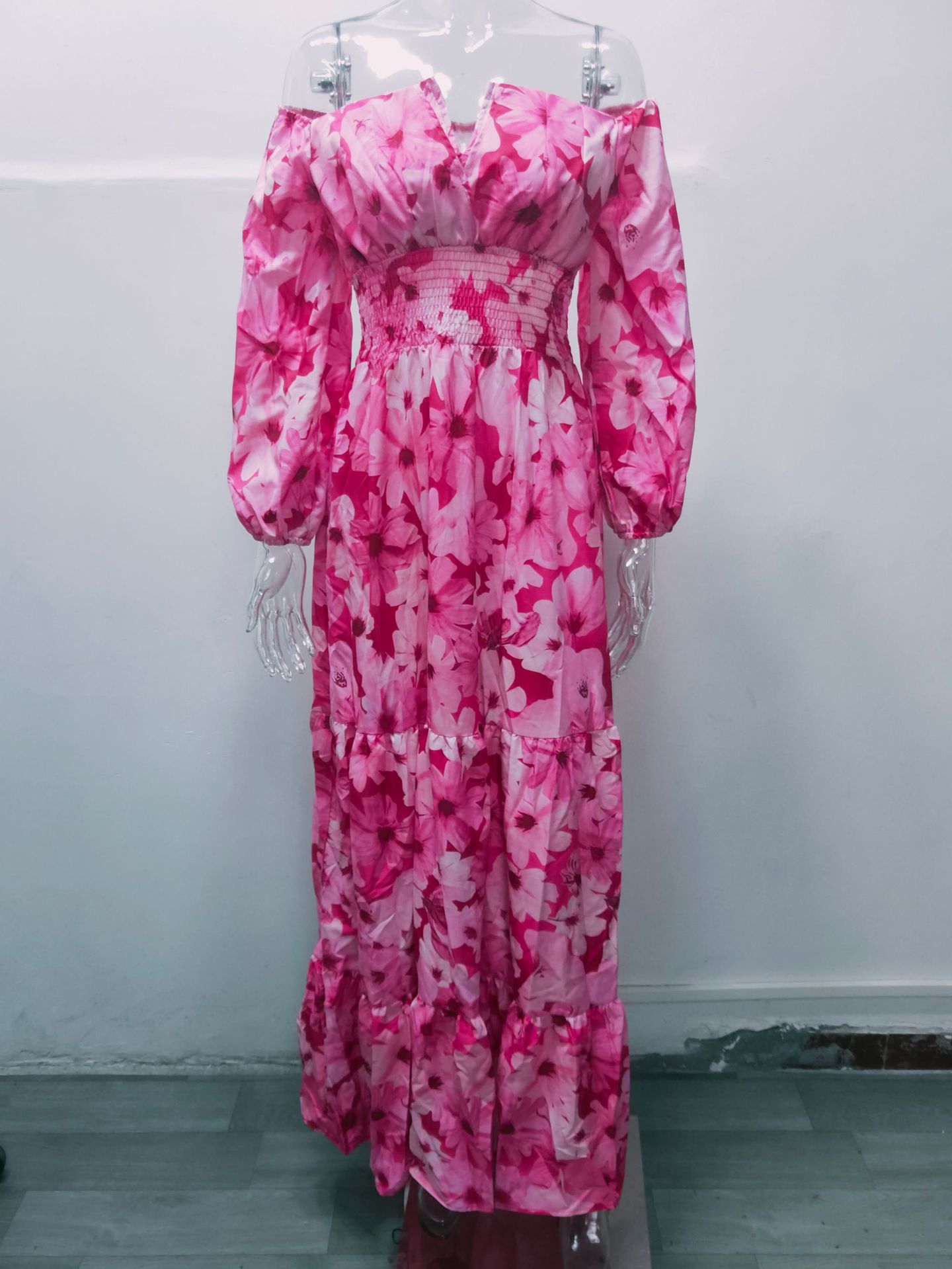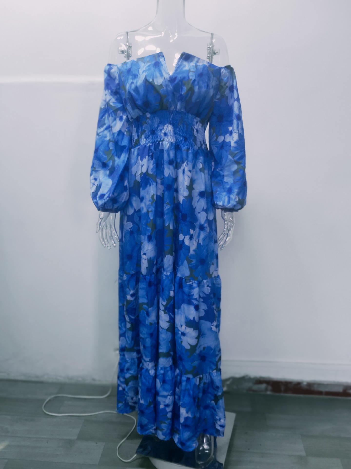Retro One-shoulder V-neck Waist Slimming Long-sleeved Dress