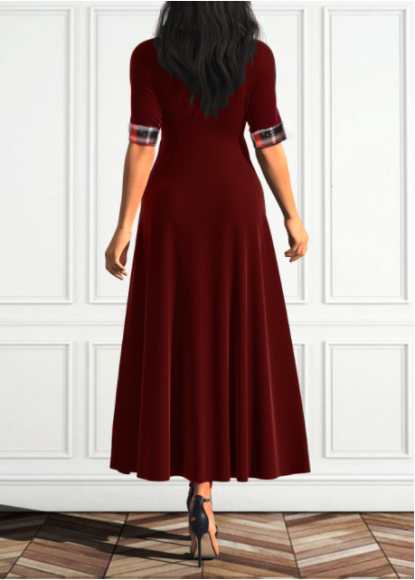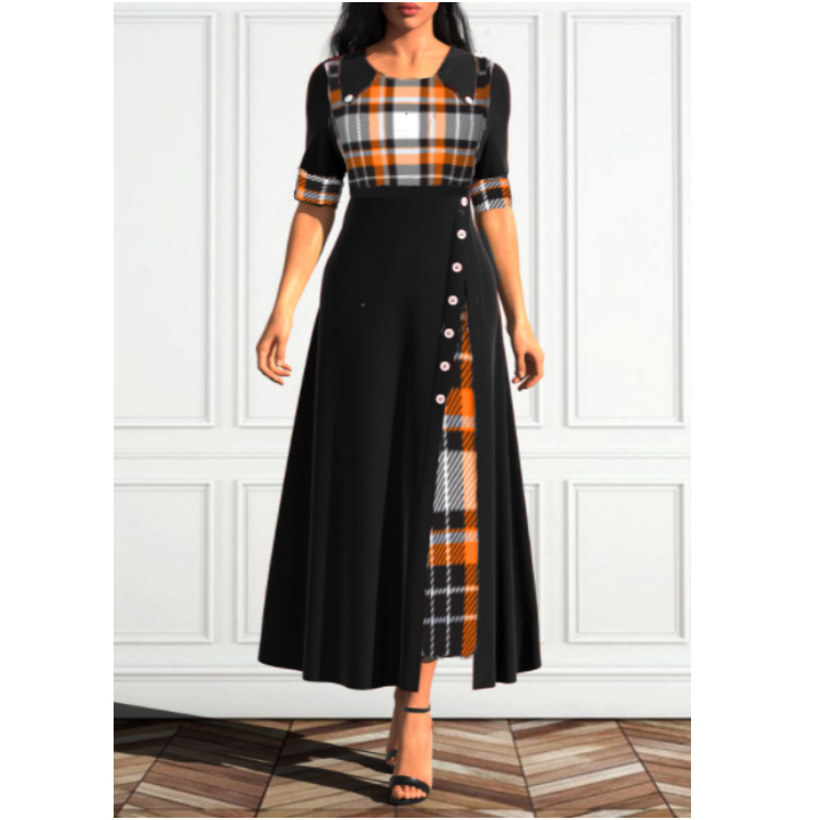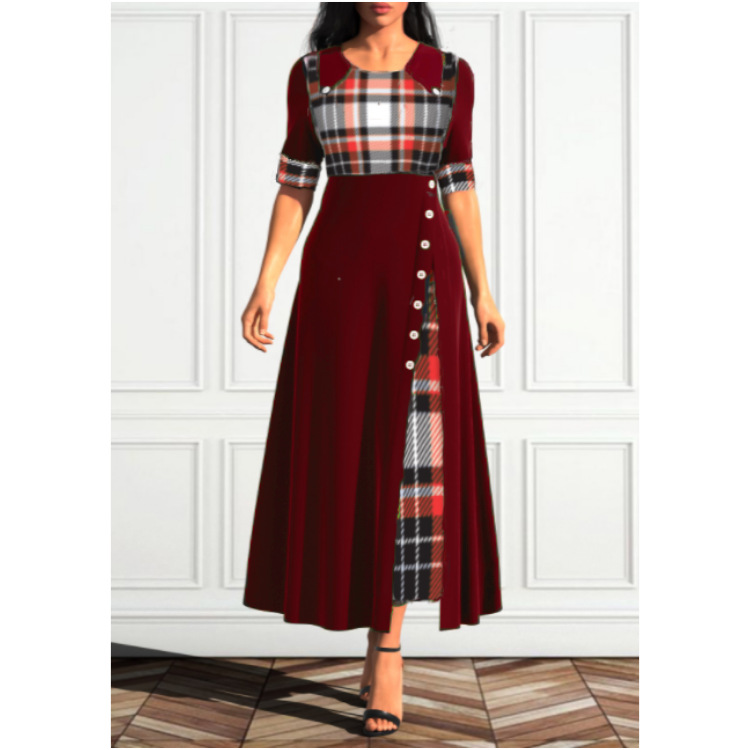 Round Neck Mid Sleeve Contrast Plaid Irregular Dress