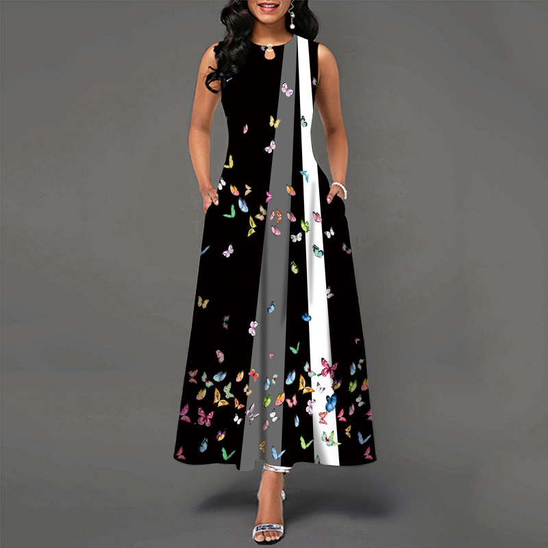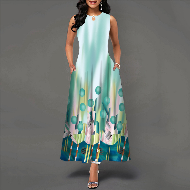 Sleeveless Printed Pocket Swing Crew Neck Tank Dress