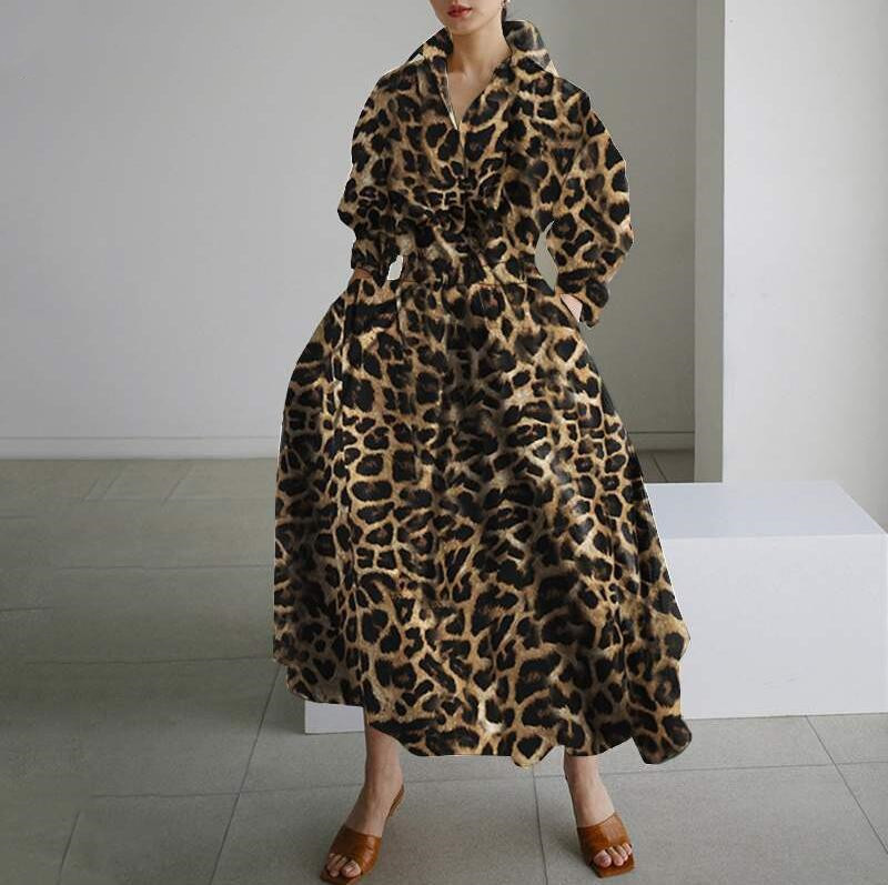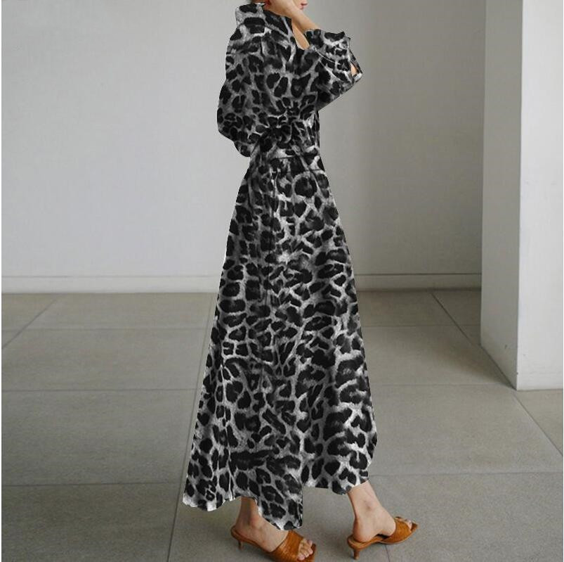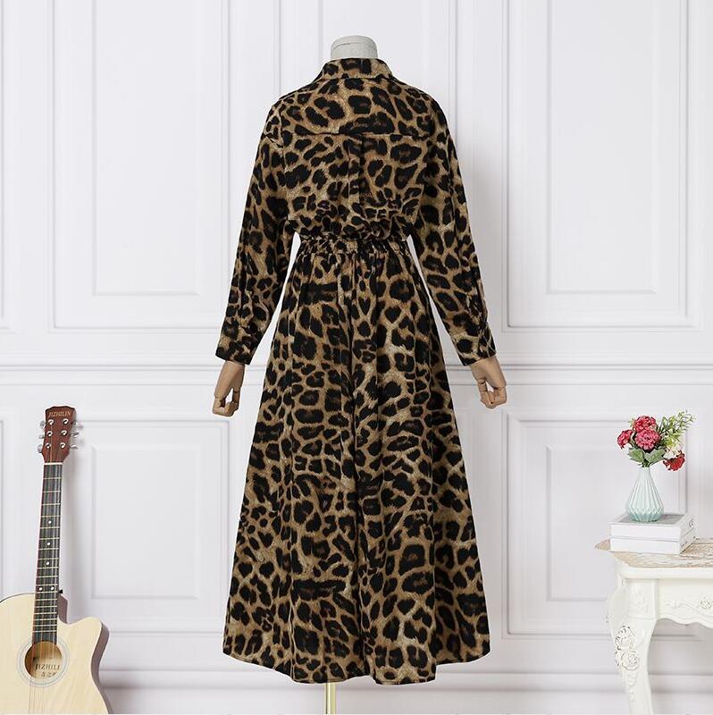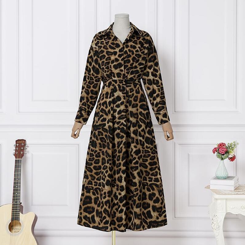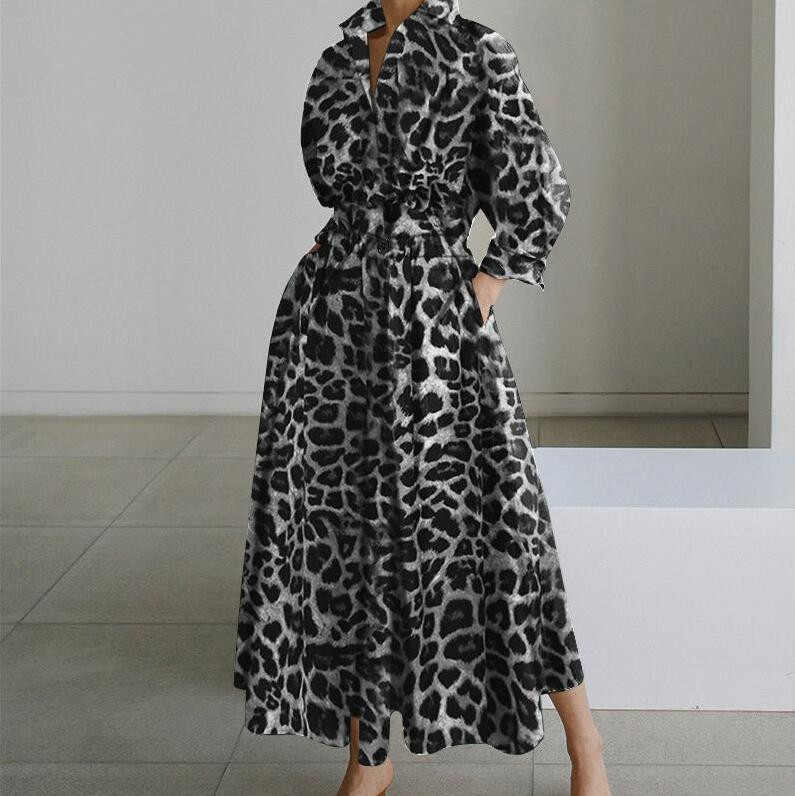 Women Elegant Leopard Print Long Sleeve Cinched Waist Shirt Dress