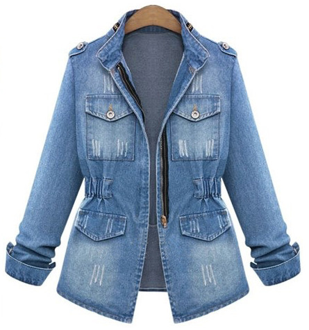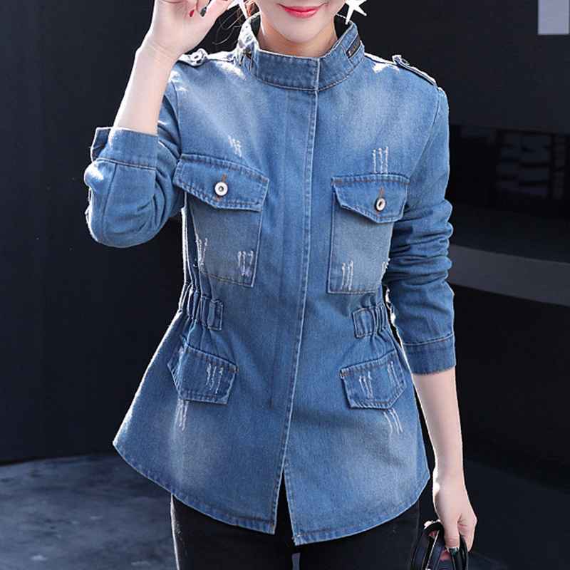 Women's Band Collar Elastic Waist Light Wash Denim Jacket