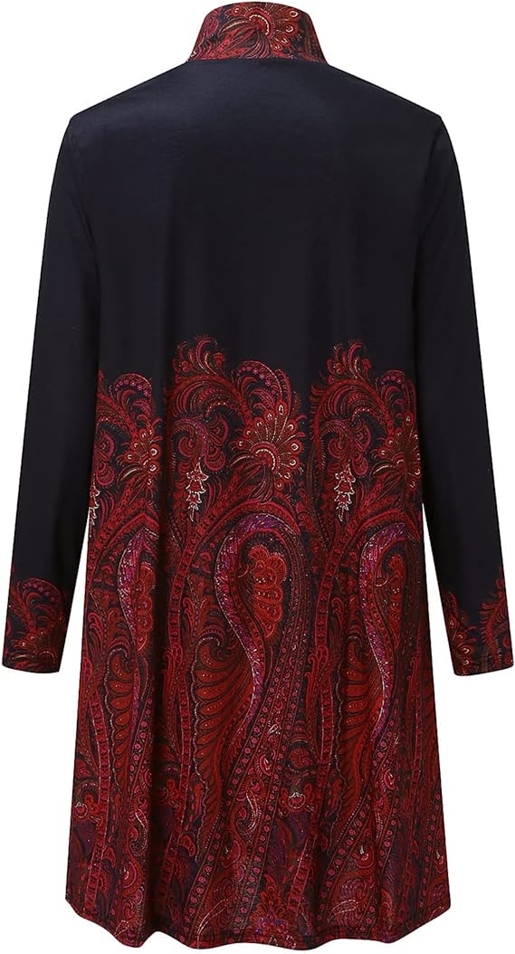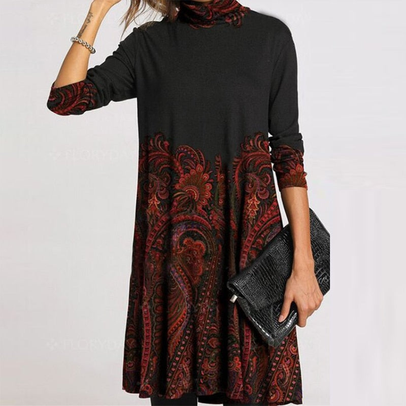 Women's Fashion Cashew Flowers Print Half Turtleneck Long Sleeve Loose Mini Dress