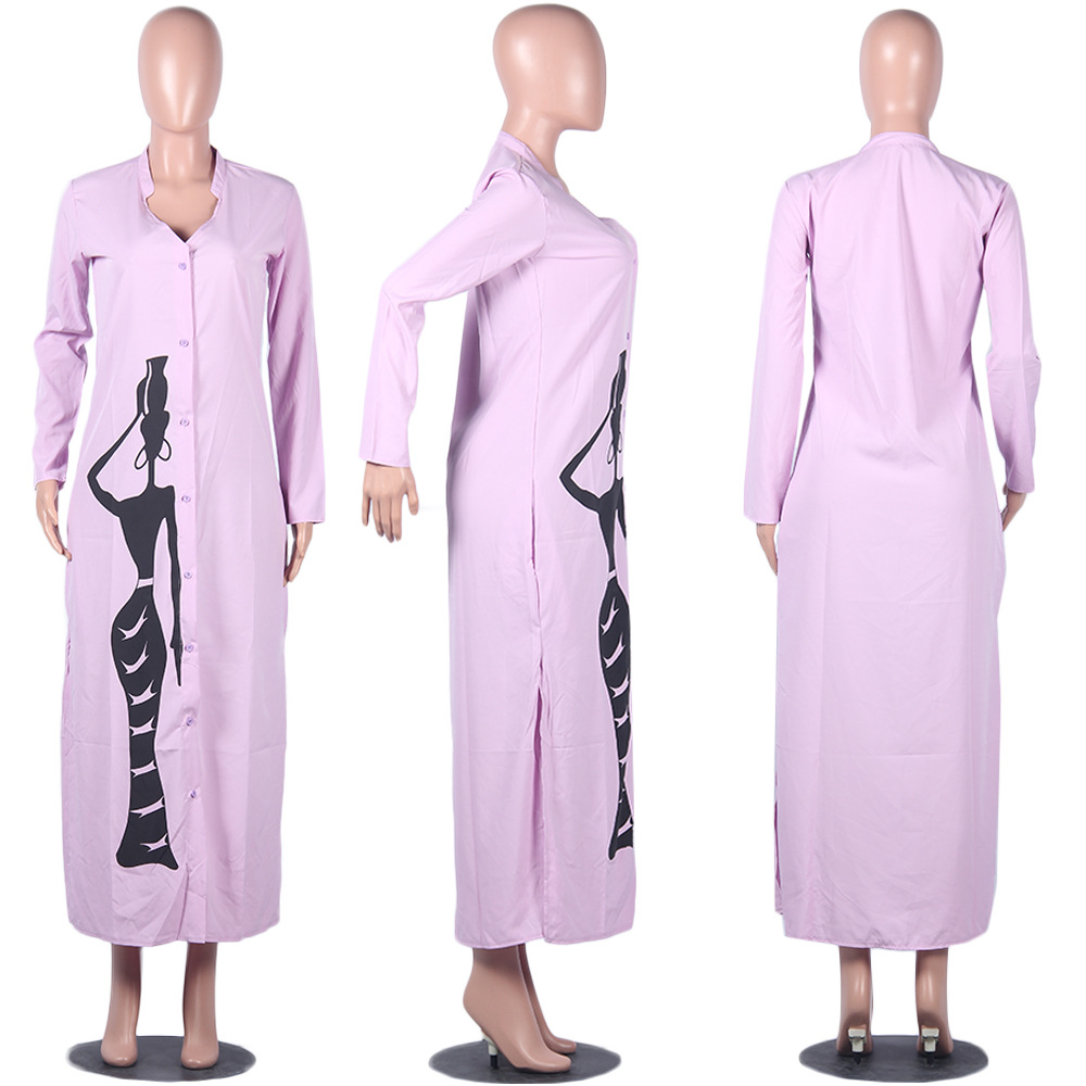 Women's Long Sleeve Printed V-Neck Slit Long Shirt Dress