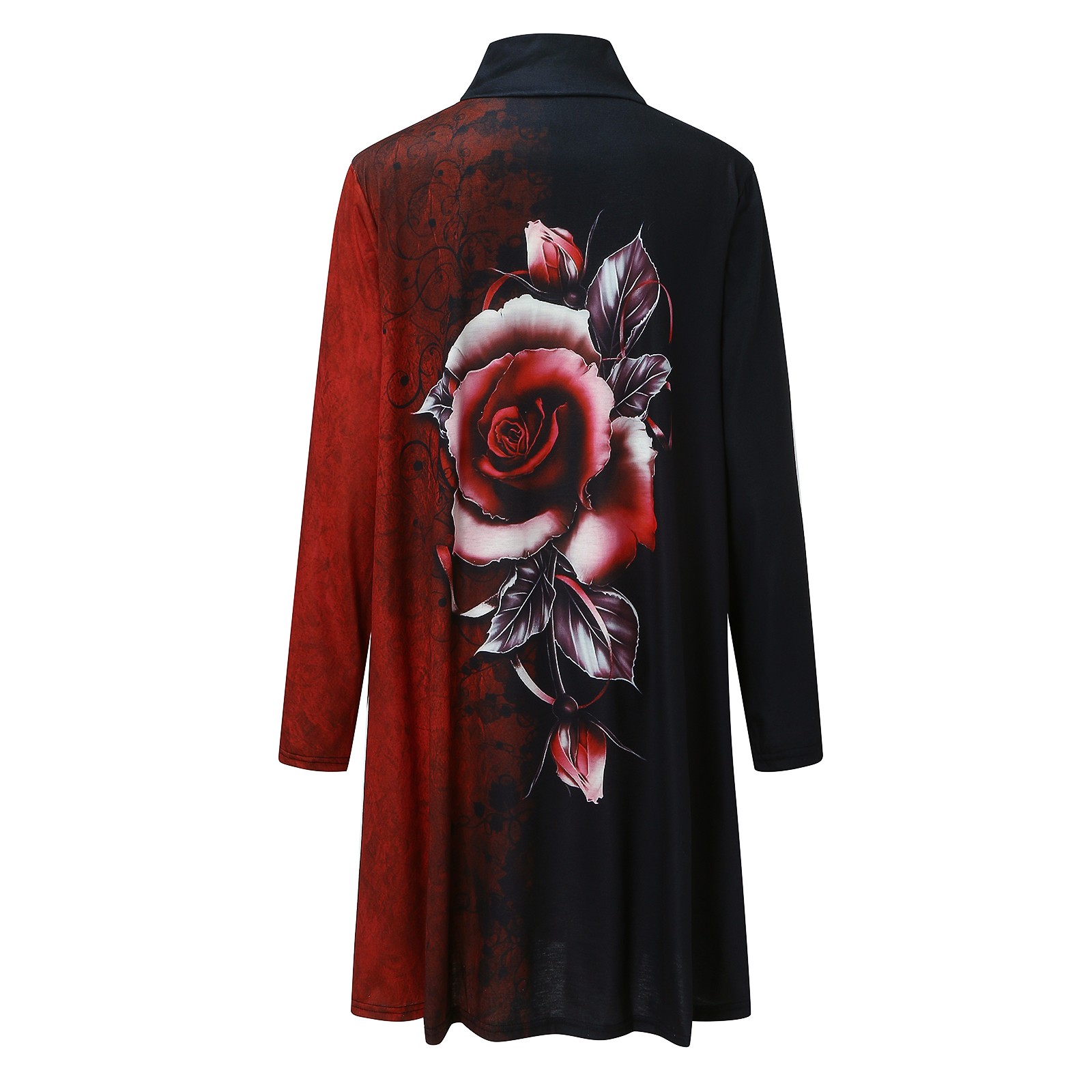 Women's Red Rose Print Half Turtleneck Long Sleeve Loose Mini Dress