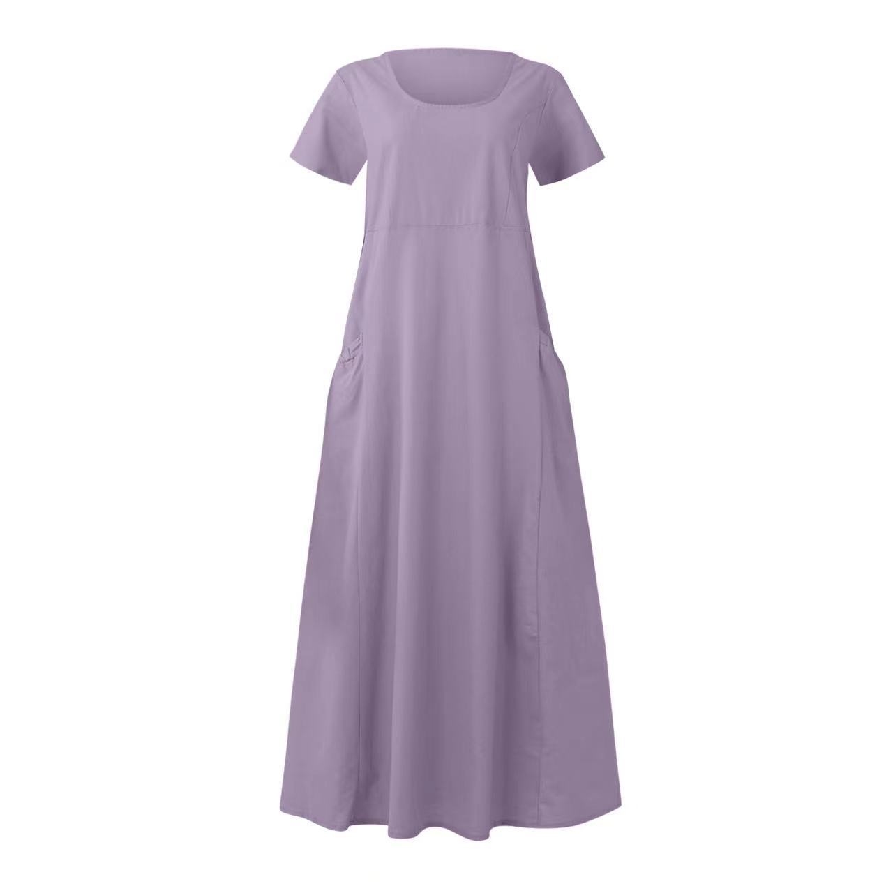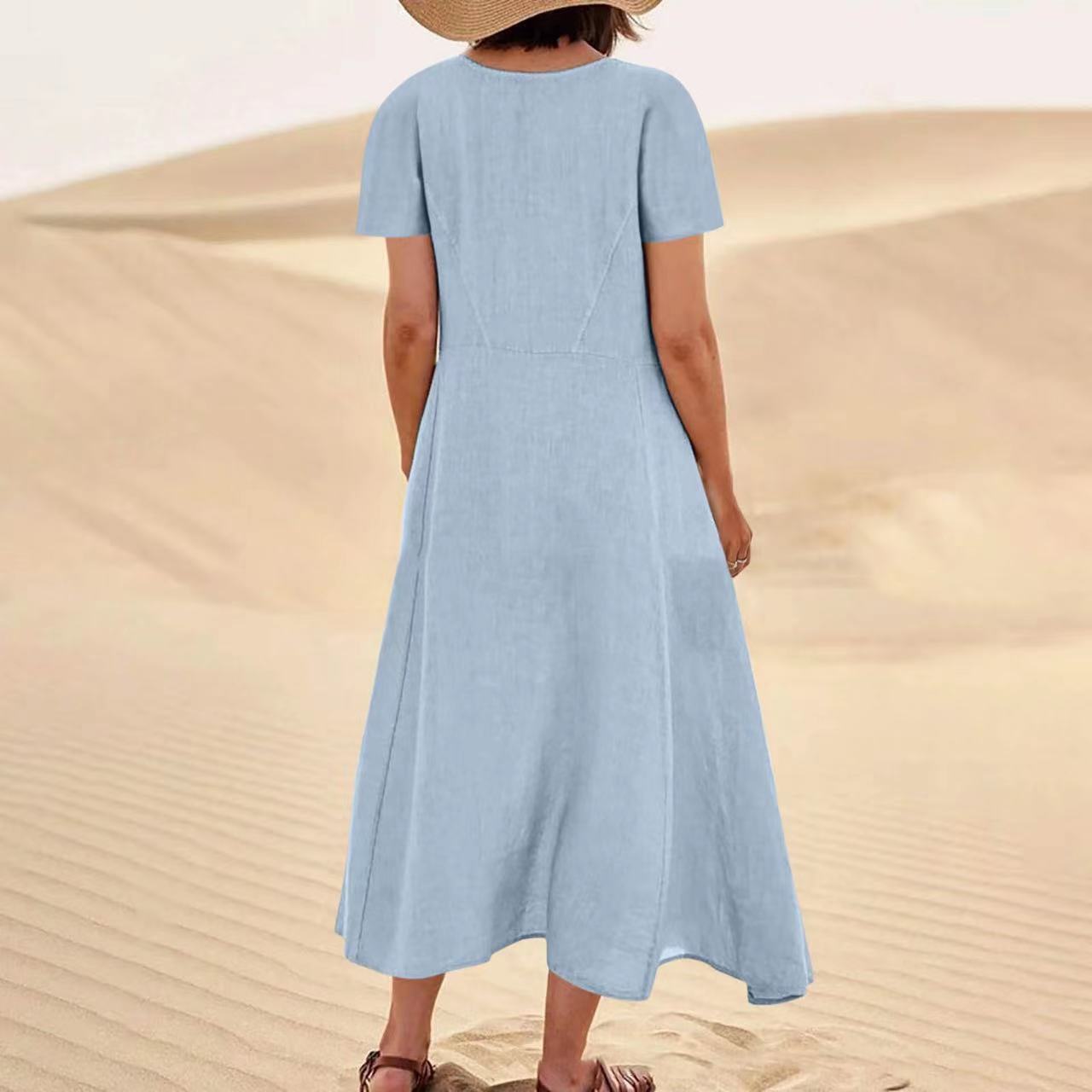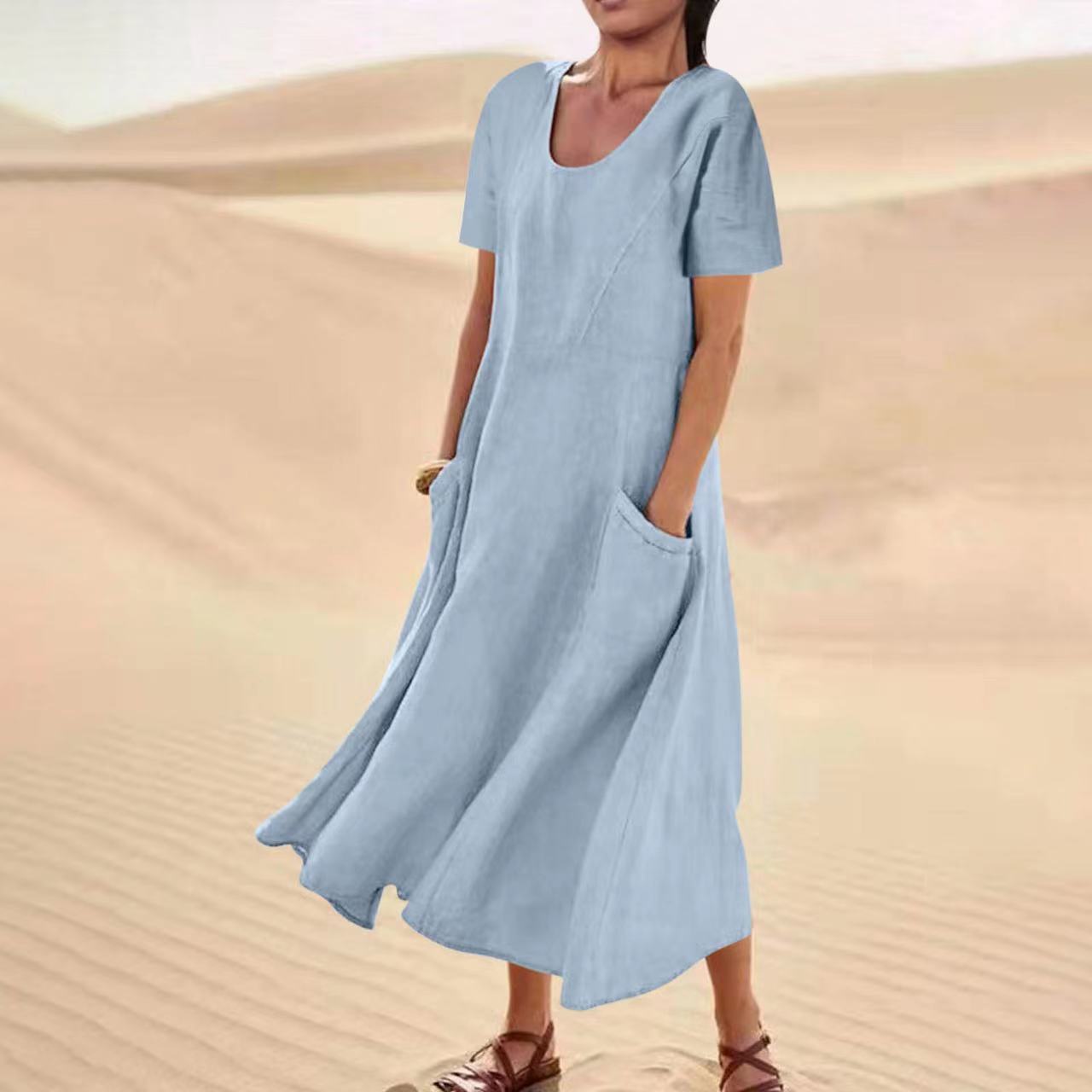 Women's Solid Color Cotton Linen Loose Casual Pocket Dress