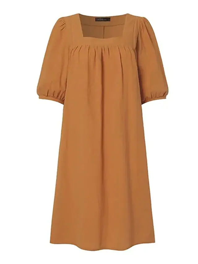 Women's Square Neck Cotton Linen Dress Simple Style Puff Sleeve Slim Fit Short Dress