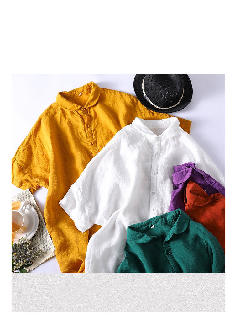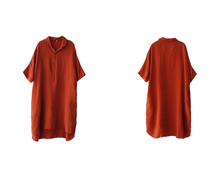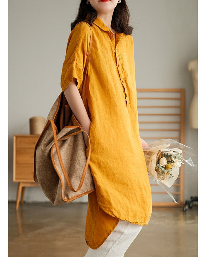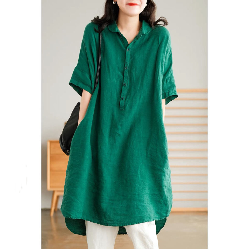 Women's Summer Retro Solid Color Linen Mid-length Shirt Loose Half-sleeved Half-Open Collar Dress